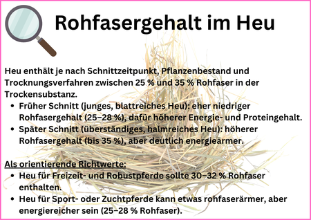 Mindestmenge Heu: 1,5 kg Heu pro 100 kg Körpergewicht täglich (also ca. 7,5 kg für ein 500 kg Pferd).