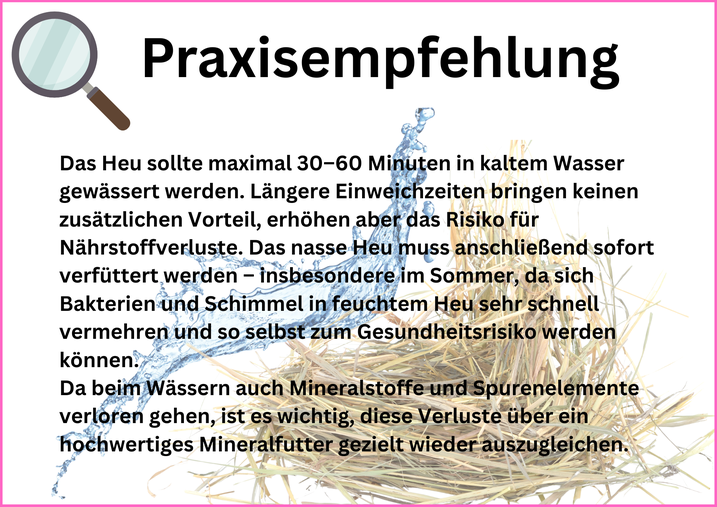 - Wässern, wenn nötig: Insbesondere für Risikopferde sinnvoll. ABER ACHTUNG! Beim Wässern gehen gleichzeitig auch wertvolle Mineralstoffe und Spurenelemente verloren. Zudem zeigen Untersuchungen, dass insbesondere im Sommer das Risiko für Bakterien- und Schimmelbildung im nassen Heu deutlich steigt. Wird das Heu zu lange eingeweicht oder nicht sofort verfüttert, kann es daher selbst zum Gesundheitsrisiko werden.